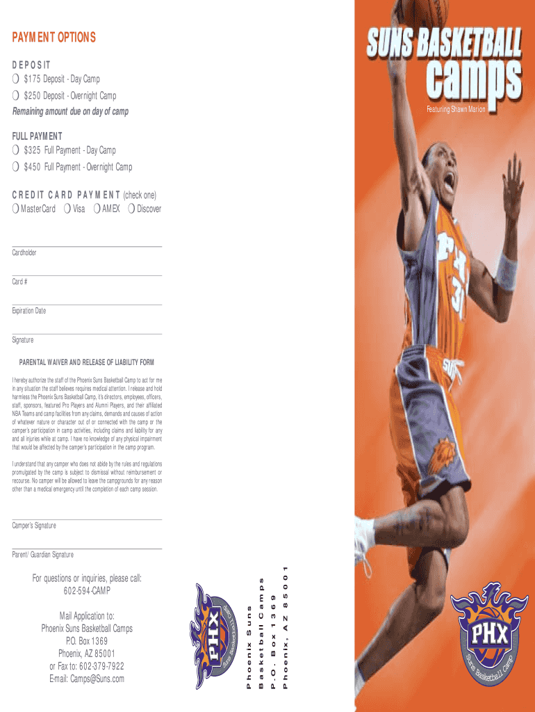 This document is a registration form for the Phoenix Suns Basketball Camps, detailing payment options, camp schedules, waivers, and camper information.