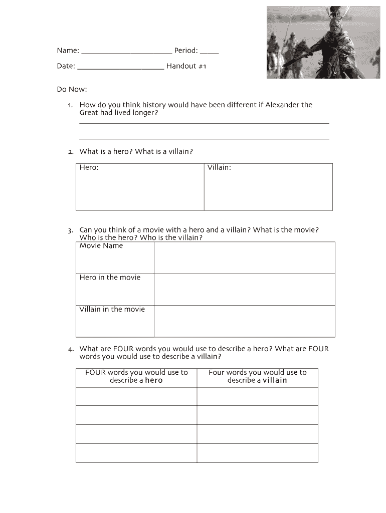 Name: Period: Date: Handout #1 Do Now: 1. How do you think history would have been different if Alexander the Great had lived longer? 2. What is a hero? What is a villain? Hero: Villain: 3. Can you