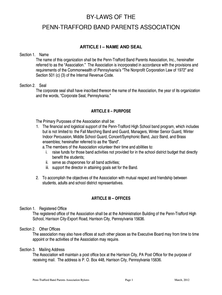 BYLAWS OF THE PENNTRAFFORD BAND PARENTS ASSOCIATION ARTICLE I NAME AND SEAL Section 1. Name The name of this organization shall be the PennTrafford Band Parents Association, Inc., hereinafter referred