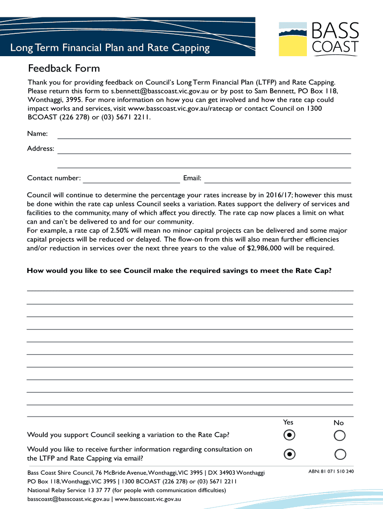 Long Term Financial Plan and Rate Capping Feedback Form Thank you for providing feedback on Councils Long Term Financial Plan (LFP) and Rate Capping. Please return this form to s. Bennett bass coast.Vic.gov.AU