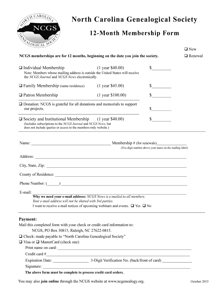 Get the free North Carolina Genealogical Society 12Month Membership Form q New NCGS memberships a...