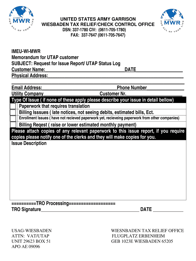 UNITED STATES ARMY GARRISON WIESBADEN TAX RELIEF×CHECK CONTROL OFFICE DSN: 3371780 CIV: (06117051780) FAX: 3377647 ×06117057647) IMEUWIMWR Memorandum for UTAH customer SUBJECT: Request for Issue