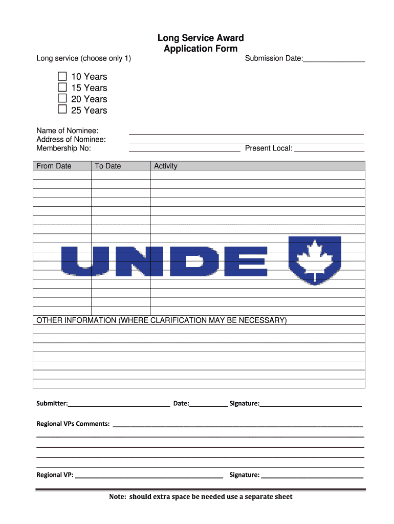 Note: should extra space be needed to use a separate sheet Long Service Award Application Form Long service (choose only 1) Submission Date: