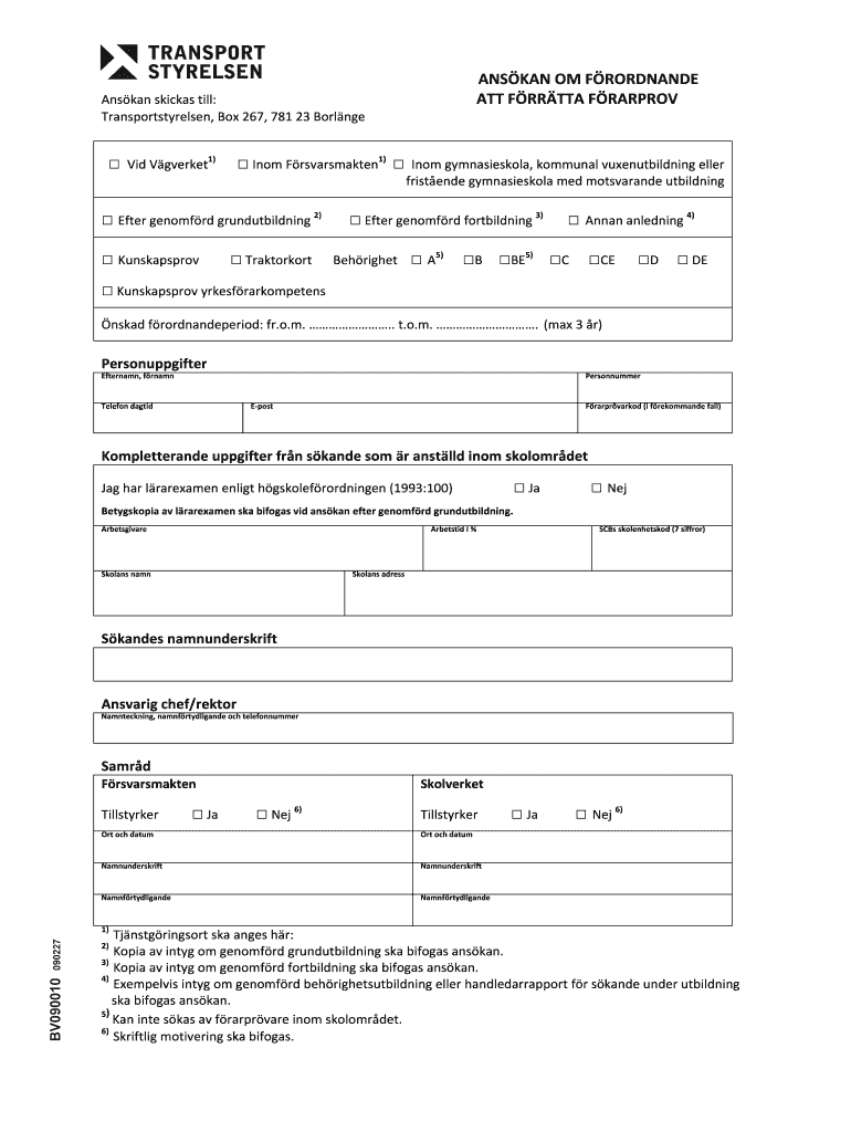 ANSKANOMFRORDNANDE ATTFRRTTAFRARPROV Anskanskickastill: Transportstyrelsen,Box267,78123Borlnge VidVgverket1) InomFrsvarsmakten1) Eftergenomfrdgrundutbildning2) Kunskapsprov Traktorkort Inomgymnasieskola,