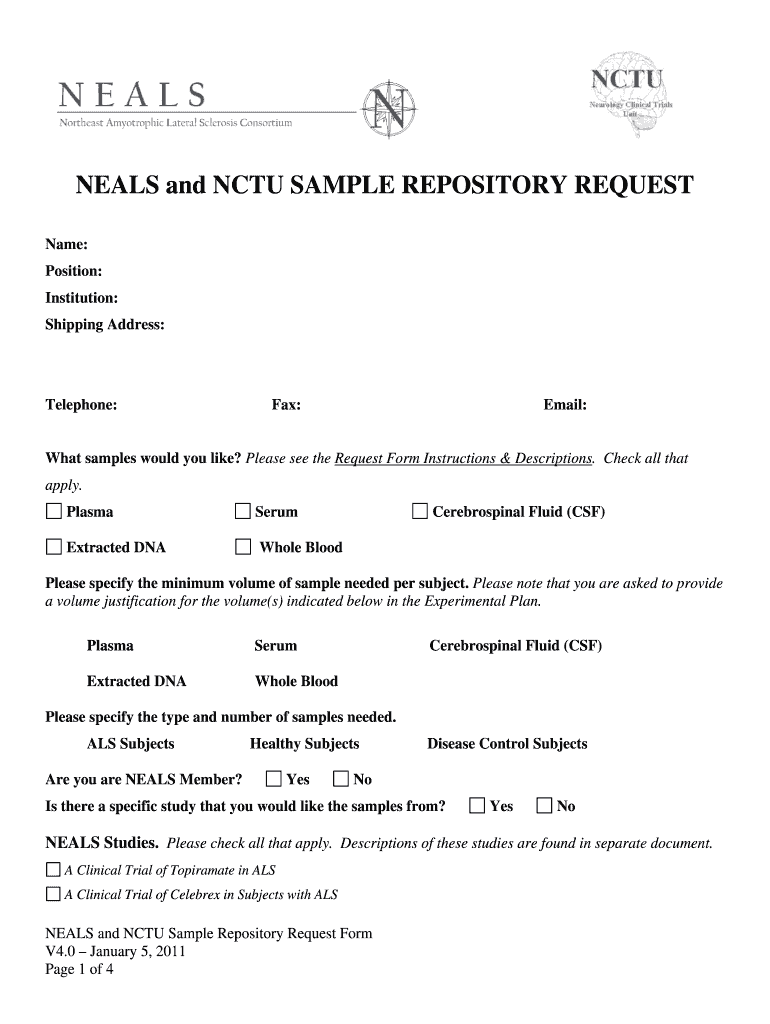 Get the free NEALS and NCTU SAMPLE REPOSITORY REQUEST - ALS Trials - alsconsortium