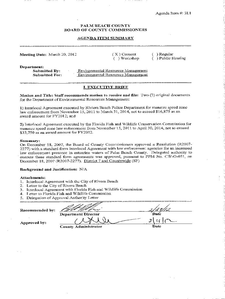 This document outlines the agreement for additional marine law enforcement services in estuarine waters of Palm Beach County during manatee season, including responsibilities, payment terms, and compliance