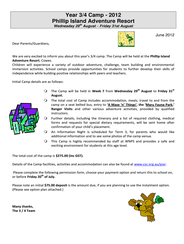 Year 3×4 Camp 2012 Phillip Island Adventure Resort Wednesday 29th August Friday 31st August June 2012 Dear Parents×Guardians, We are very excited to inform you about this year's 3×4 camp. The Camp