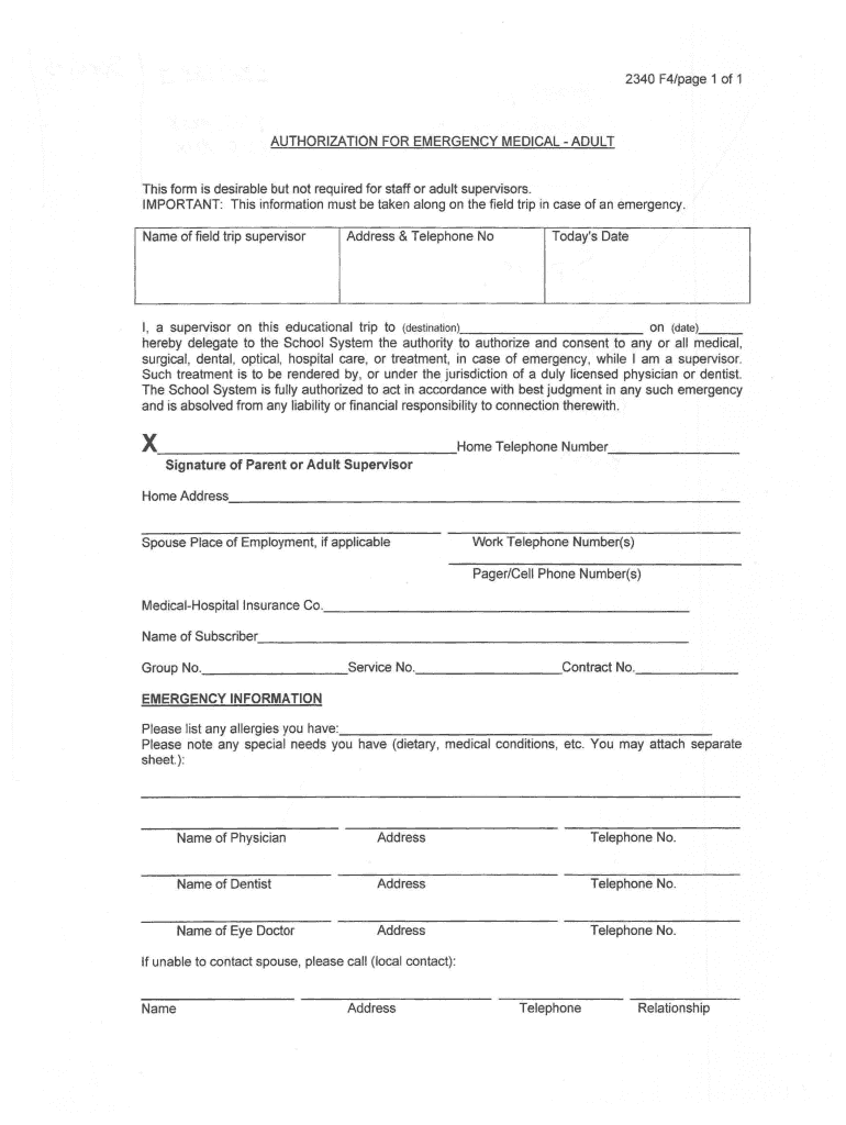 2340 F4×page 1 of 1 AUTHORIZATION FOR EMERGENCY MEDICAL ADULT This form is desirable but not required for staff or adult supervisors. IMPORTANT: This information must be taken along on the field