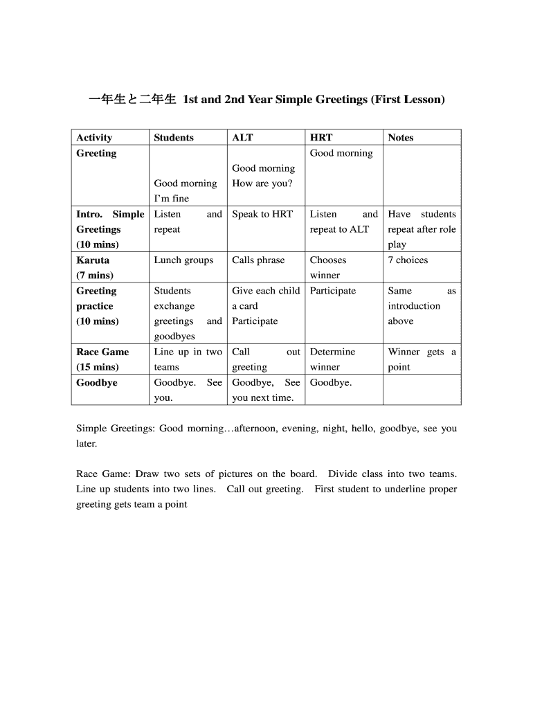 Activity 1st and 2nd Year Simple Greetings (First Lesson) Students ALT HRT Greeting Notes Good morning How are you? I'm fine Intro. Simple Listen repeat Greetings and Speak to HRT (10 mins) Karate