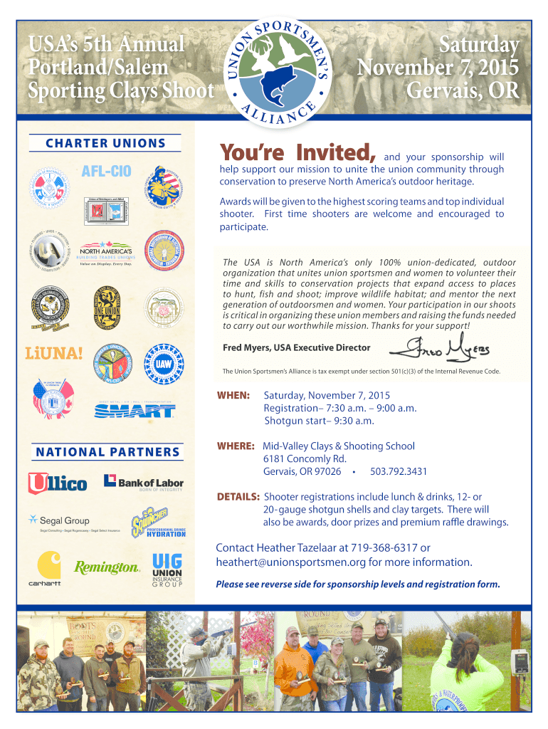 Saturday, November 7, 2015, Gervais, OR USA's 5th Annual Portland×Salem Sporting Clays Shoot C HARTE R U N IO N S You're Invited, and your sponsorship will help support our mission to unite the union
