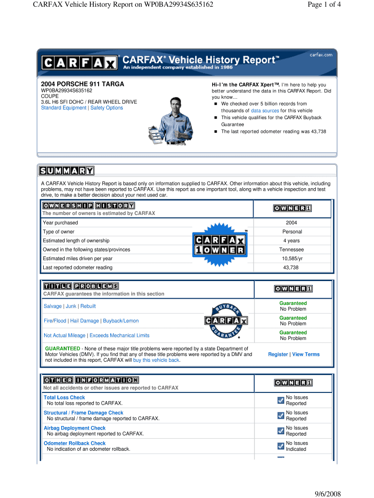 CARFAX Vehicle History Report on WP0BA29934S6351622004 PORSCHE 911 TAIGA WP0BA29934S635162 COUPE 3.6L H₆ SFI DOHC / REAR-WHEEL DRIVE Standard Equipment Safety Options Page 1 of 4HiI'm the CARFAX
