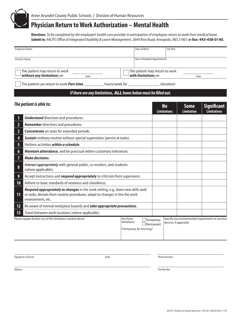 Anne Arundel County Public Schools Division of Human Resources Physician Return to Work Authorization Mental Health Directions: To be completed by the employees' health care provider in anticipation