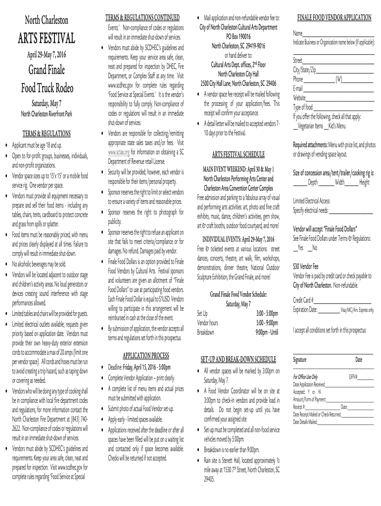 TERMS & REGULATIONS CONTINUED North Charleston ARTS FESTIVAL April 29May 7, 2016 Grand Finale Food Truck Rodeo Saturday, May 7 North Charleston Riverfront Park TERMS & REGULATIONS Applicant must be
