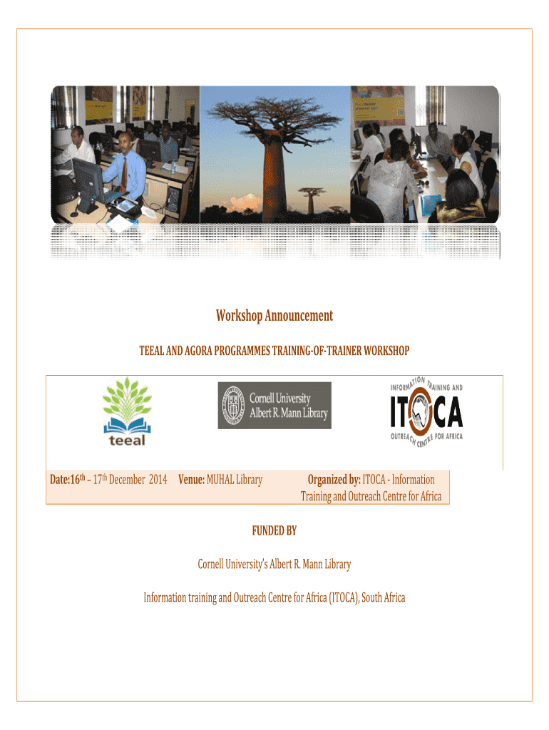 Workshop Announcement TEAL AND AGORA Programs TRAININGOFTRAINER WORKSHOP Date:16th 17th December 2014 Venue: MURAL Library Organized by: IMOCA Information Training and Outreach Center for Africa FUNDED