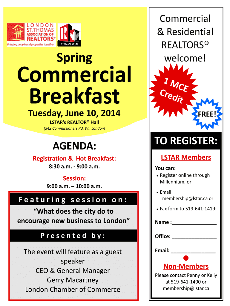 Spring Commercial Breakfast Commercial & Residential REALTORS welcome! 1M CE Cr edit Tuesday, June 10, 2014, FREE! Stars REALTOR Hall (342 Commissioners Rd. W., London) AGENDA: TO REGISTER: STAR Members