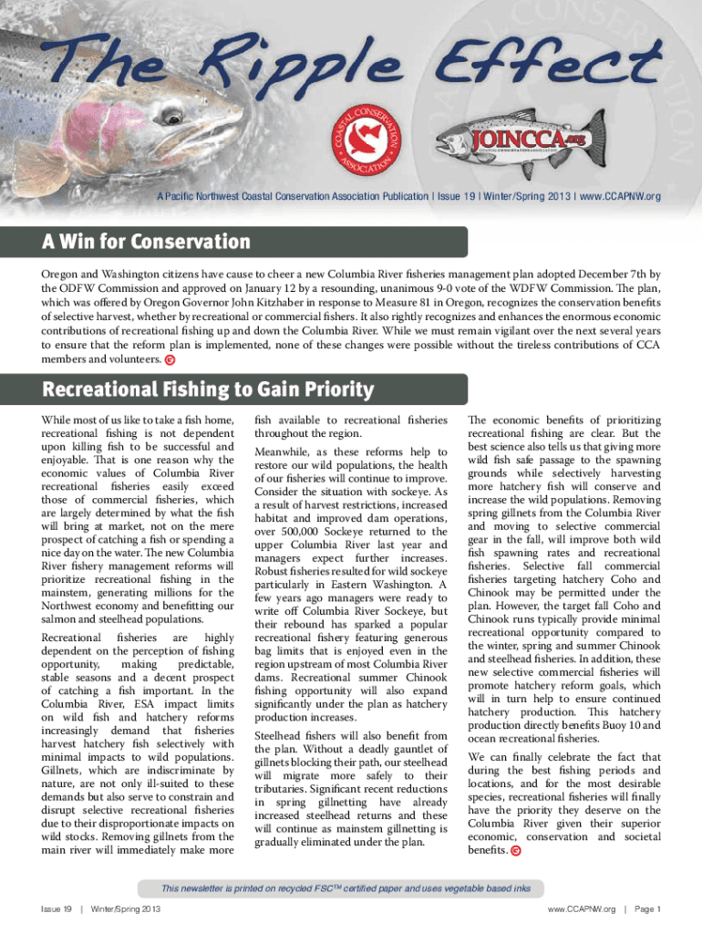 A Pacific Northwest Coastal Conservation Association Publication | Issue 19 | Winter/Spring 2013 | www.CCAPNW.orgA Win for Conservation Oregon and Washington citizens have cause to cheer a new Columbia