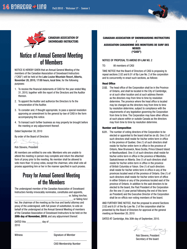 14 Fall 2010 Volume 17 Issue 1 CANADIAN ASSOCIATION OF SNOWBOARD INSTRUCTORS Notice of Annual General Meeting of Members NOTICE IS HEREBY GIVEN that an Annual General Meeting of the members of the