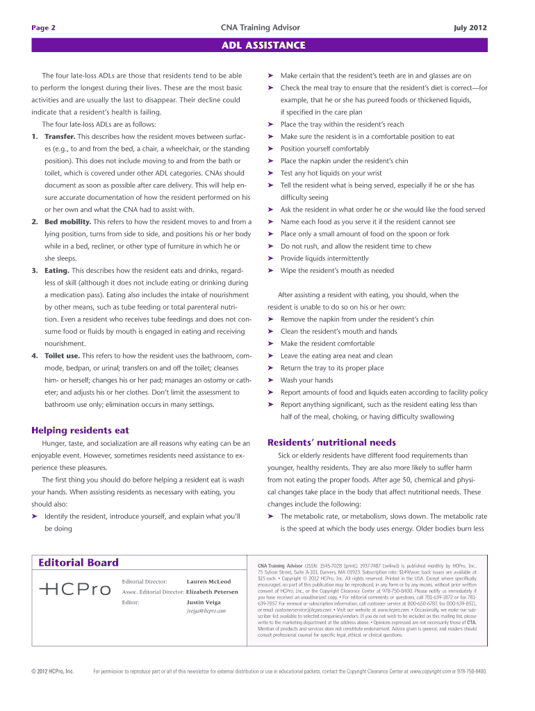CNA Training Advisor Page 2 July 2012 ADL ASSISTANCE The four late loss ADLs are those that residents tend to be able to Make certain that the residents teeth are in and glasses are on to perform