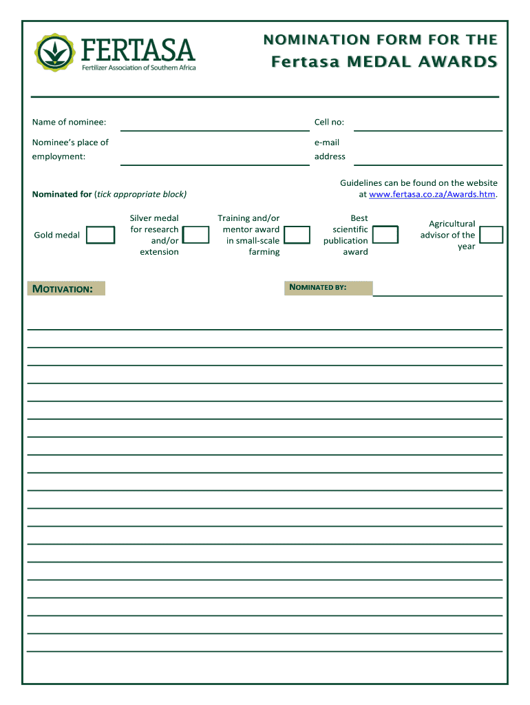 NOMINATION FORM FOR THE Name of nominee: Cell no: Nominees place of email employment: address Guidelines can be found on the website at www.fertasa.co.za×Awards.htm. Nominated for (tick appropriate