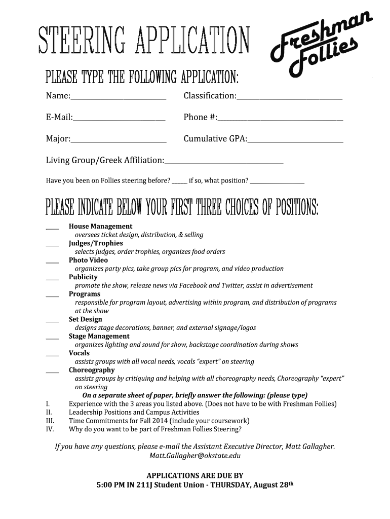 Name: Classification: Email: Phone #: Major: Cumulative GPA: Living Group×Greek Affiliation: Have you been on Follies steering before? If so, what position? I. II. III. IV. House Management oversees
