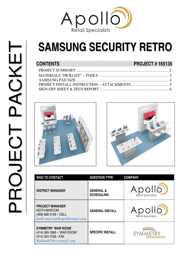PR O J E C T P AC K ET SAMSUNG SECURITY RETRO CONTENTS PROJECT # 165135 PROJECT SUMMARY 2 MATERIALS PICK-LIST TOOLS. 3 SAMSUNG PAD SIZE 4 PROJECT INSTALL INSTRUCTION ATTACHMENTS 5 SIGN-OFF SHEET &