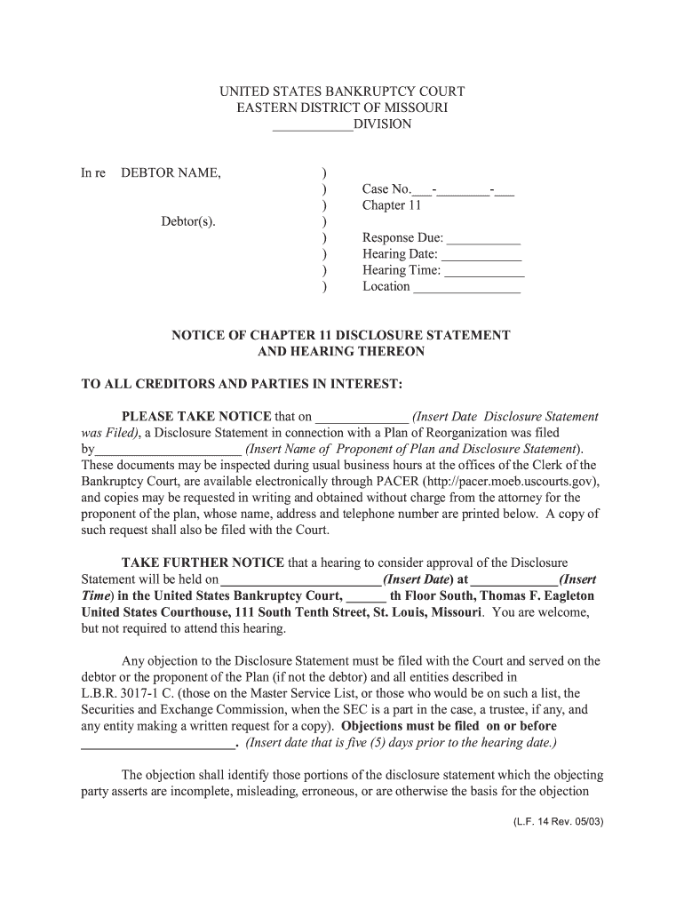 (L.F. 14 Rev. ... NOTICE OF CHAPTER 11 DISCLOSURE STATEMENT ... Court, are available electronically through PACER (HTTP://pacer.mob.us courts.gov×, ... TAKE FURTHER NOTICE that a hearing to consider
