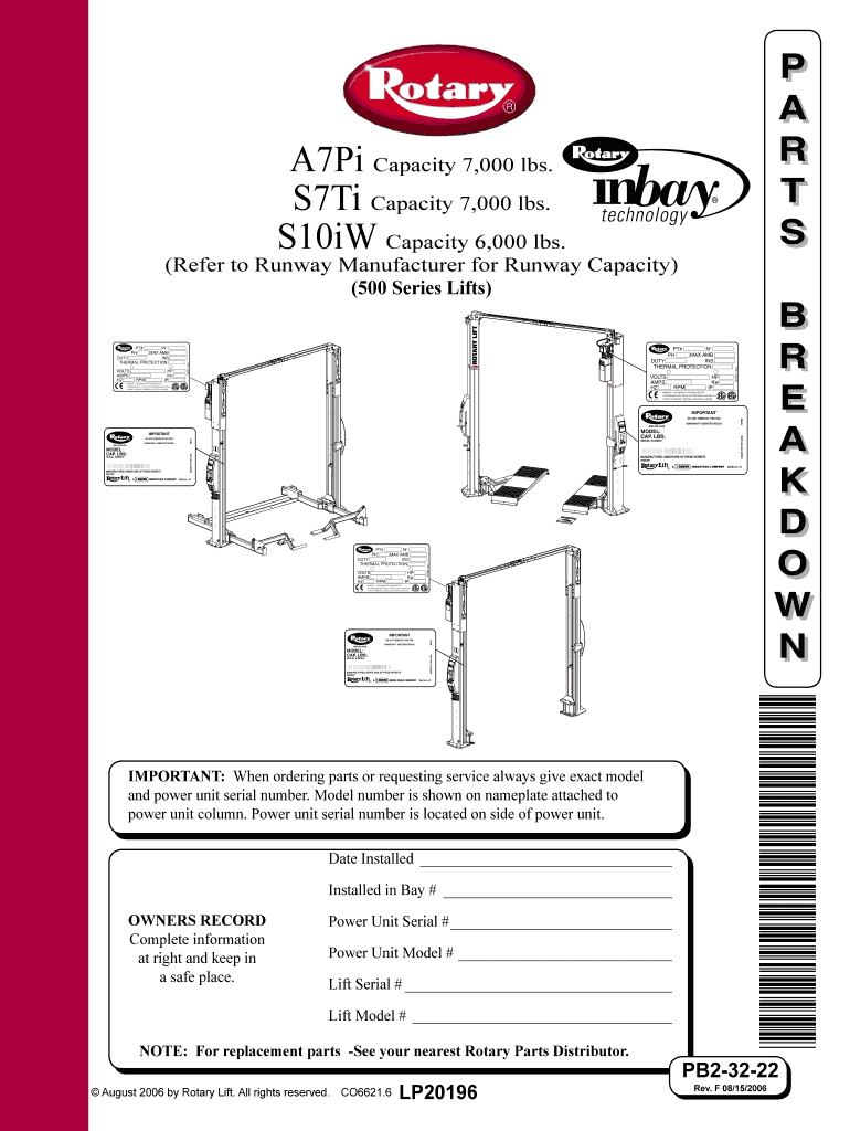 P A A R R T T S A7Pi Capacity 7,000 lbs. S7Ti Capacity 7,000 lbs. S10iW Capacity 6,000 lbs. (Refer to Runway Manufacturer for Runway Capacity) (500 Series Lifts) WARNING: HP Kw IP RPM NP493 Rev. VOLTS