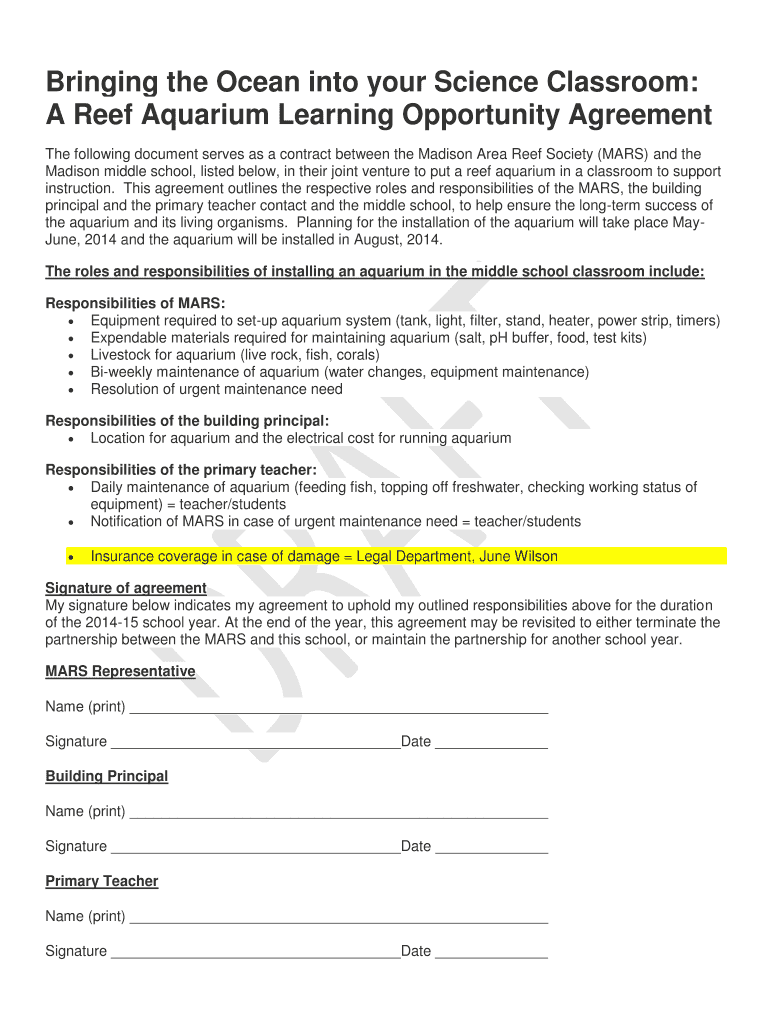 The following document serves as a contract between the Madison Area Reef Society (MARS) and the
