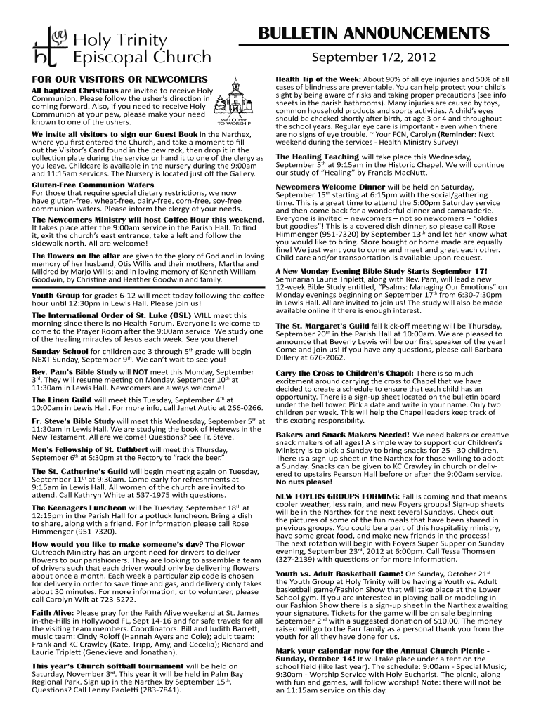 BULLETIN ANNOUNCEMENTS Holy Trinity Episcopal Church September 1×2, 2012 FOR OUR VISITORS OR NEWCOMERS All baptized Christians are invited to receive Holy Communion. Please follow the ushers' direction