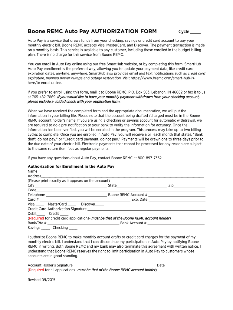 Boone REM Auto Pay AUTHORIZATION FORM Cycle Auto Pay is a service that draws funds from your checking, savings or credit card account to pay your monthly electric bill. Boone REM accepts Visa, MasterCard,