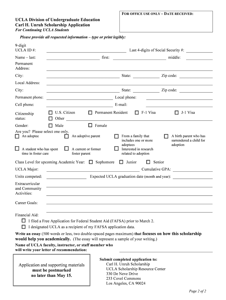 Get the free Unruh Scholarship application CT2010 - scholarshipcenter ucla