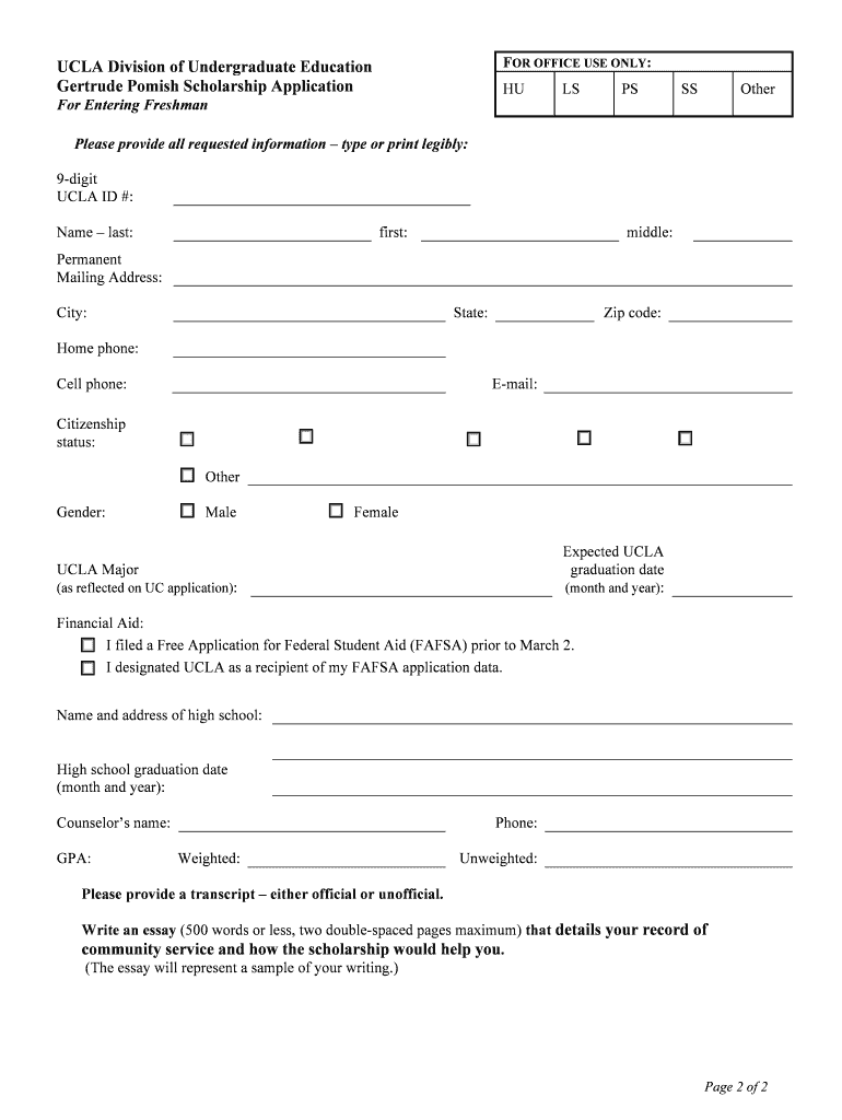 UCLA Division of Undergraduate Education Gertrude Polish Scholarship Application For Entering Freshmen UCLA is pleased to announce the Gertrude Polish Scholarship for UCLA students. Eligibility: Preference