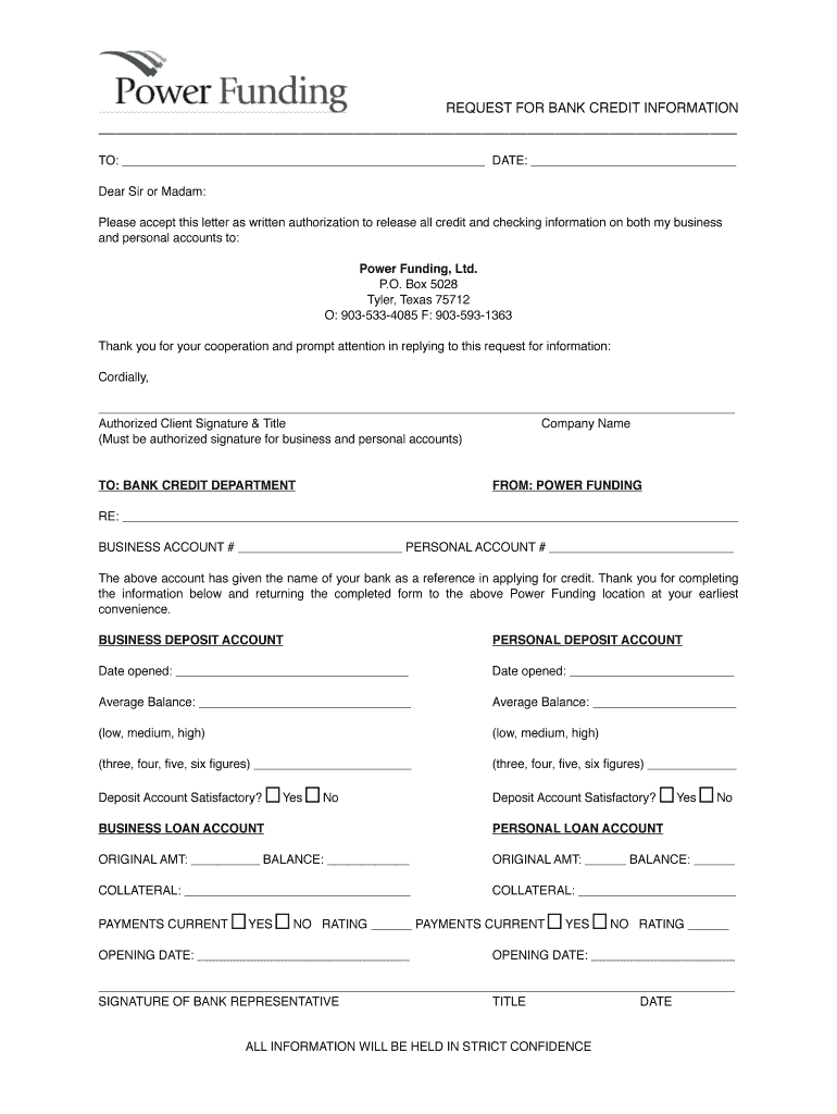The Request for Bank Credit Information is a business form used by clients to authorize their bank to release credit and checking information to Power Funding, Ltd.