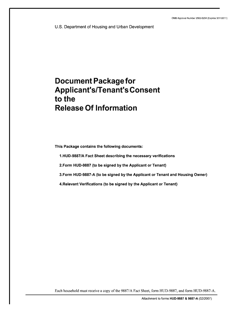 The HUD-9887 is a Notice and Consent for the Release of the Tenant's Information. It's signed by the tenant and submitted to the HUD, Owner and Management Agent, or Public Housing Agency.