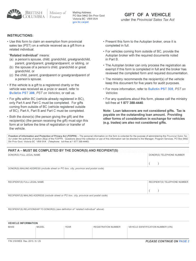 Mailing Address: PO Box 9442 STN Prov Govt Victoria BC v8w 9v4 gov.bc.ca×PST GIFT OF A vehicle under the Provincial Sales Tax Act INSTRUCTIONS: Use this form to claim an exemption from provincial