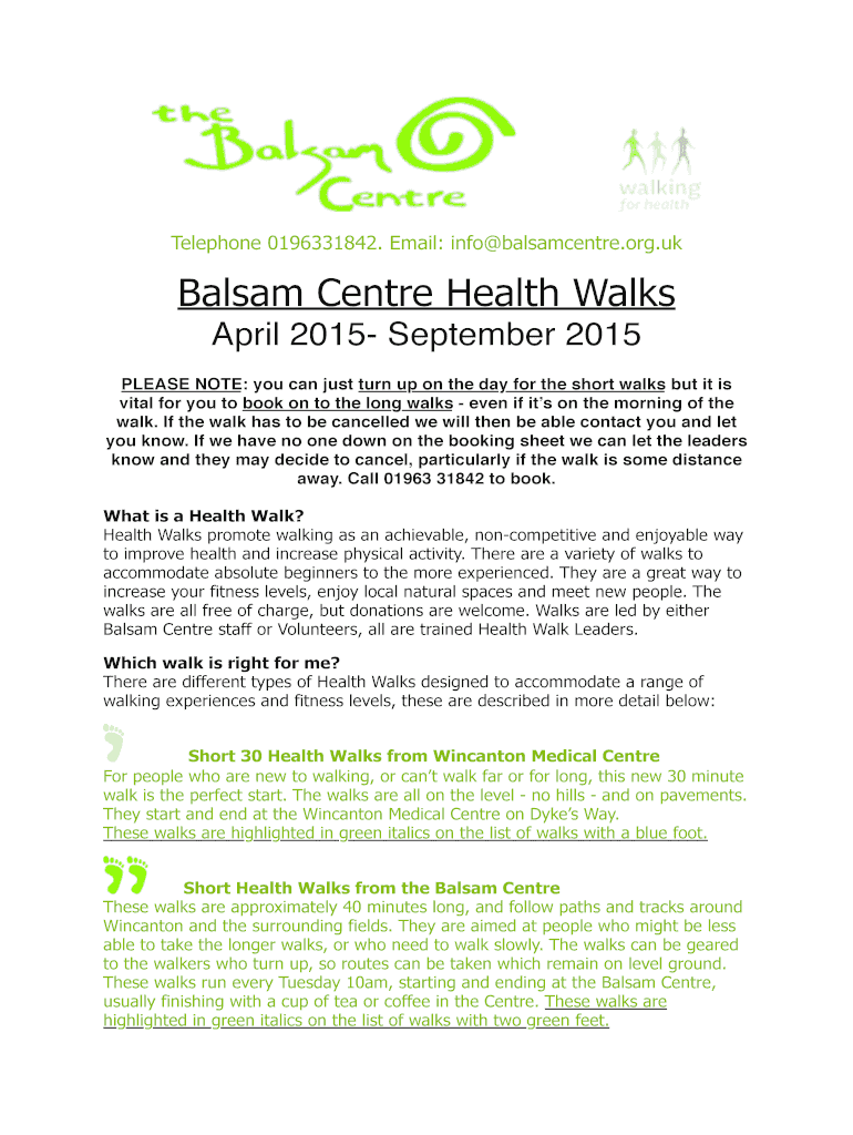 Telephone 0196331842. Email: info balsamcentre.org.UK Balsam Center Health Walks April 2015 September 2015 PLEASE NOTE: you can just turn up on the day for the short walks, but it is vital for you