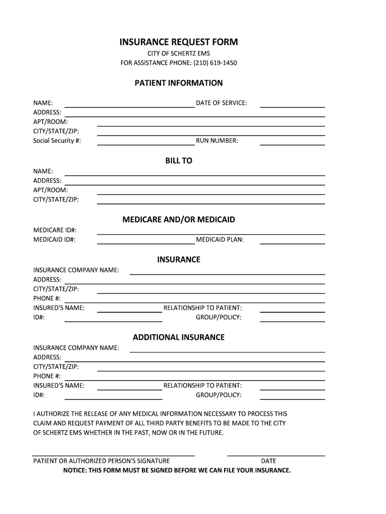 Patients receiving services from Schertz EMS are the primary users of the Insurance Request Form. This form is essential in various scenarios, including ambulance services, where insurance claim authorization is necessary. By completing the patient information form, users can ensure the processing of their insurance claims seamlessly.