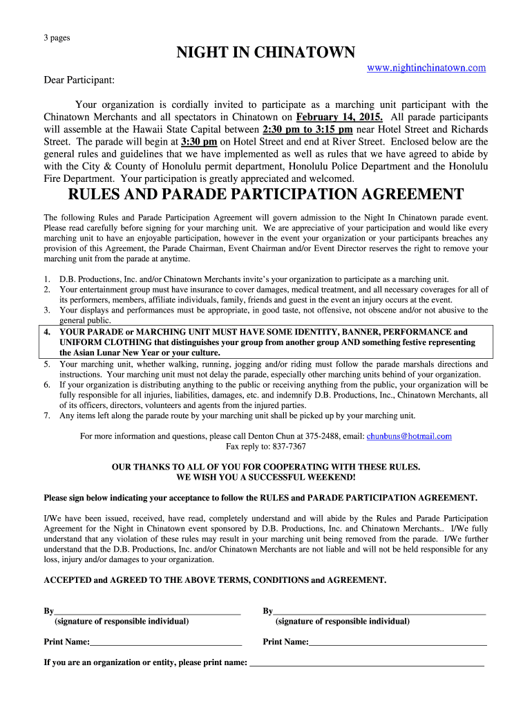 3 pages NIGHT IN CHINATOWN www.nightinchinatown.com Dear Participant: Your organization is cordially invited to participate as a marching unit participant with the Chinatown Merchants and all spectators