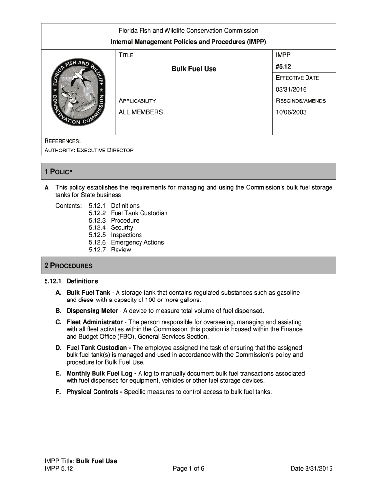 Florida Fish and Wildlife Conservation Commission Internal Management Policies and Procedures (MPP) TITLE MPP Bulk Fuel Use #5.12 EFFECTIVE DATE 03×31/2016 APPLICABILITY RESCINDS×AMENDS ALL MEMBERS