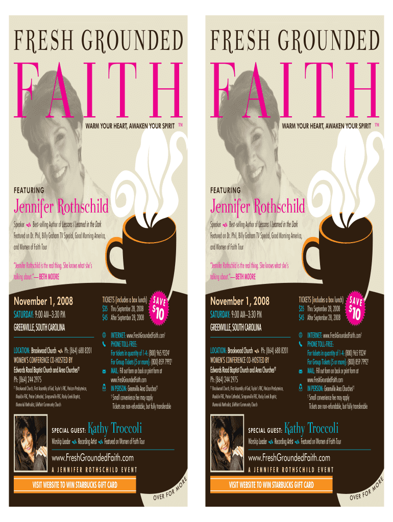 Promotional document for a women's conference featuring Jennifer Rothschild and Kathy Troccoli, highlighting event details, ticket information, and speakers' backgrounds.
