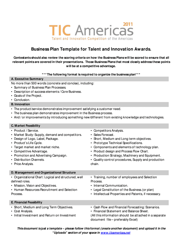 Business Plan Template for Talent and Innovation Awards. Contestants should also review the scoring criteria on how the Business Plans will be scored to ensure that all relevant points are covered