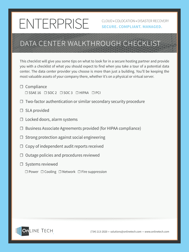 EnterpriseCLOUD COLOCATION DISASTER RECOVERYSECURE. COMPLIANT. MANAGED.data center walkthrough checklist This checklist will give you some tips on what to look for in a secure hosting partner and