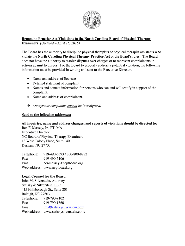 Reporting Practice Act Violations to the North Carolina Board of Physical Therapy Examiners (Updated April 15, 2016) The Board has the authority to discipline physical therapists or physical therapist
