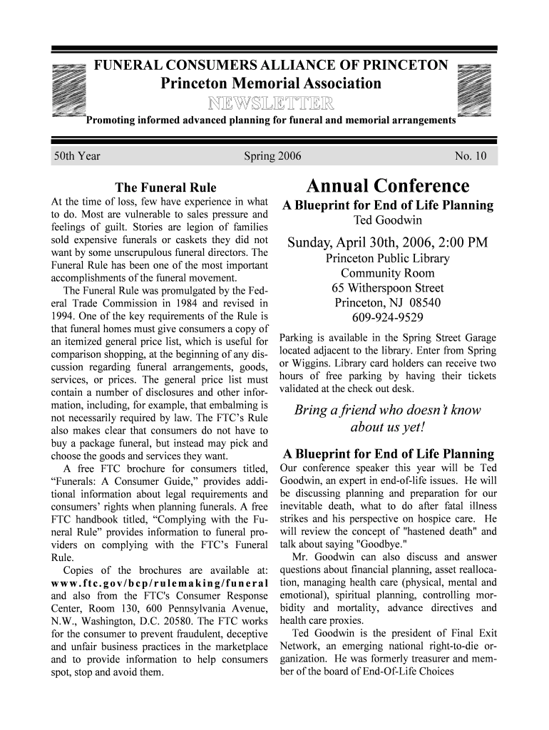 FM ERA CO SUMMERS ALLIE CE OF PRI VETO Princeton Memorial Association Promoting informed advanced planning for funeral and memorial arrangements 50th Year Spring 2006 The Funeral Rule At the time