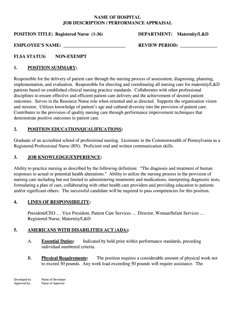 NAME OF HOSPITAL JOB DESCRIPTION / PERFORMANCE APPRAISAL POSITION TITLE: Registered Nurse (136) DEPARTMENT: Maternity×L&D EMPLOYEES NAME: REVIEW PERIOD: FLEA STATUS: 1. NONEXEMPT POSITION SUMMARY: