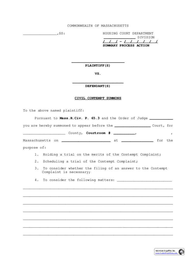 The Massachusetts Civil Contempt Summons is a legal document used by the Housing Court to summon a plaintiff for a contempt complaint trial or scheduling.