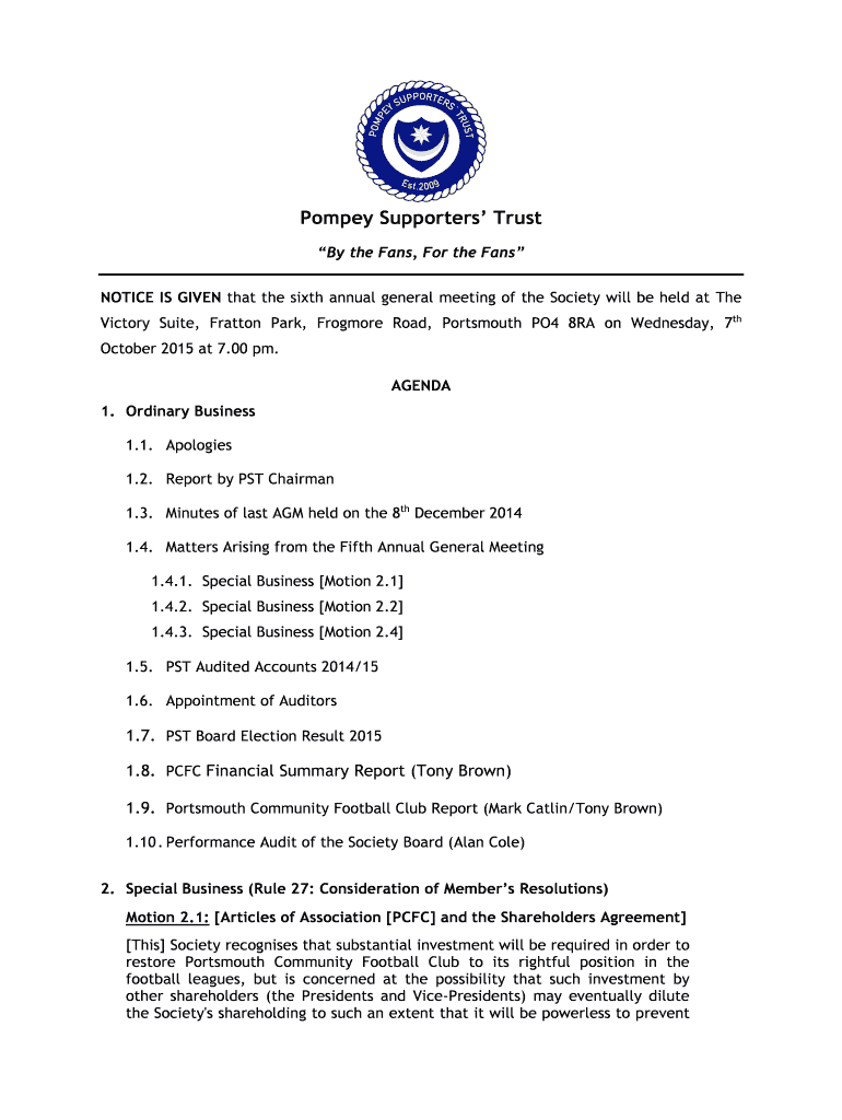 Pompey Supporters Trust By the Fans, For the Fans NOTICE IS GIVEN that the sixth annual general meeting of the Society will be held at The Victory Suite, Frat ton Park, Frog more Road, Portsmouth