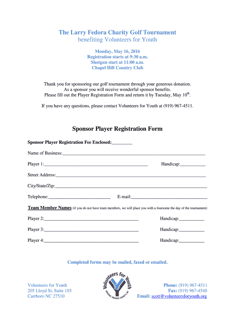 The Larry Fedora Charity Golf Tournament benefiting Volunteers for Youth Monday, May 16, 2016, Registration starts at 9:30 a.m. Shotgun start at 11:00 a.m. Chapel Hill Country Club Thank you for sponsoring
