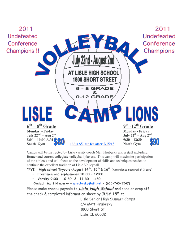 6th 8th Grade 9th 12th Grade Monday Friday, July 22nd Aug 2nd 8:00 10:00 A. M South Gym Monday Friday, July 22nd Aug 2nd 9:30 12:30 North Gym adds a ×5 late fee after 7×15/13 Camps will be instructed