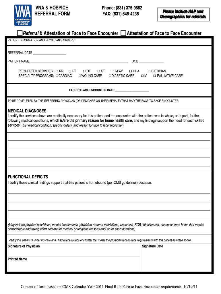VIA & HOSPICE REFERRAL FORM Print Reset Phone: (831× 3759882 FAX: (831× 6484238 Referral & Attestation of Face to Face Encounter Please include H&P and P ease NC due H&P and Demographics for rrefferrrralls